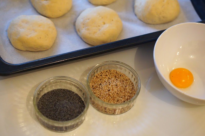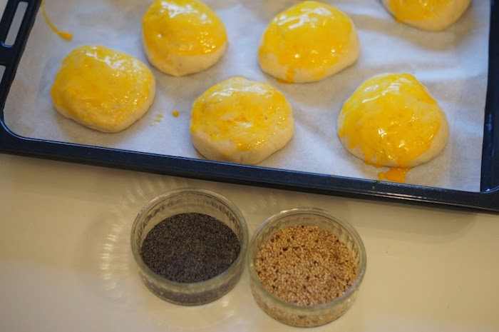 3 ) Après le repos, préchauffez votre four à environ 200° en chaleur tournante. Passer un jaune d’oeuf au pinceau sur chacun des buns, pour les rendre dorés & brillants. Puis ajoutez les graines de votre choix (j’ai choisi sésame et pavot, mes préférés, et en ai laissé quelques uns natures). Quand le four est chaud, enfournez votre plaque pendant 10 minutes. Puis vérifiez la cuisson pendant encore 2 ou 3 minutes jusqu’à ce que les buns soient dorés, gonflés, cuits au dessus, mais aussi en dessous.