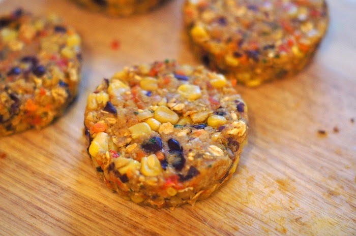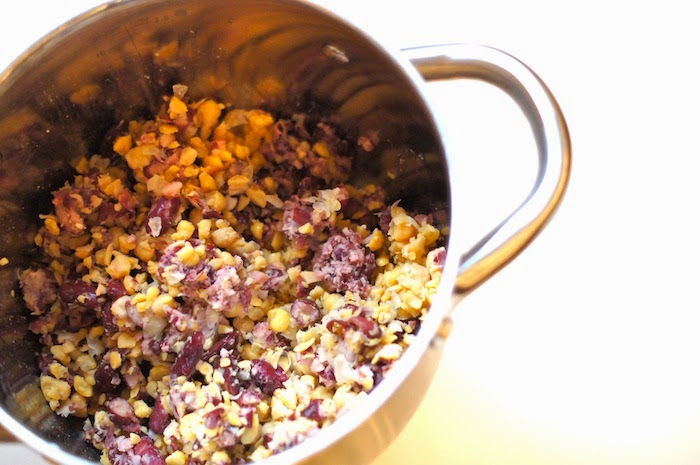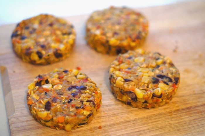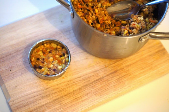 2 ) Égouttez et rincez les pois chiches et les haricots rouges. Mixez les rapidement (mais attention, pas trop sinon vous allez obtenir une purée!). Mettez les dans un saladier & ajoutez les herbes, les épices, le sel et le poivre, les légumes cuits, le maïs, la chapelure, les flocons d’avoine et l’oeuf. Mélangez, directement avec vos mains, jusqu’à obtenir quelque chose d’uniforme!