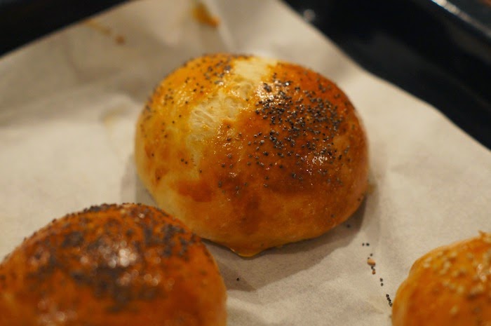 3 ) Après le repos, préchauffez votre four à environ 200° en chaleur tournante. Passer un jaune d’oeuf au pinceau sur chacun des buns, pour les rendre dorés & brillants. Puis ajoutez les graines de votre choix (j’ai choisi sésame et pavot, mes préférés, et en ai laissé quelques uns natures). Quand le four est chaud, enfournez votre plaque pendant 10 minutes. Puis vérifiez la cuisson pendant encore 2 ou 3 minutes jusqu’à ce que les buns soient dorés, gonflés, cuits au dessus, mais aussi en dessous.